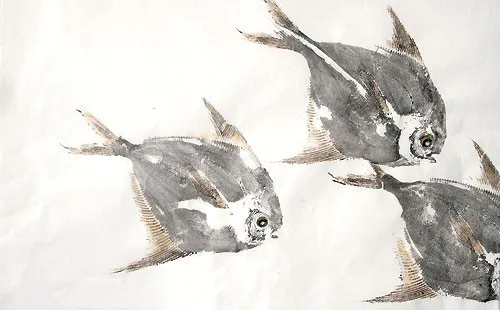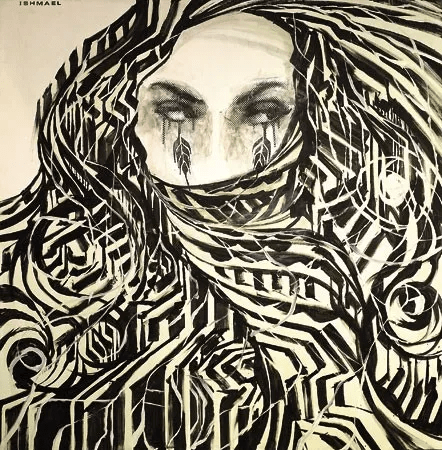He describes it as a black, white, red, and gold portrait on a “regular size” piece of paper. The subject is wearing a koi fish headdress. Cotto does not have a copy of the sketch, only a partial tracing of the headgear.