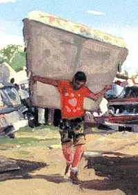 Only one artist had a room of his own — Kevin Taylor, holding what he described as “part garage sale, part art show.” The ubiquitous artist was selling off private knick knacks along with his original art spanning student sketches from 1994 (hung on a clothes line) to paintings from the past couple of years. The area was intended to resemble his living room, complete with couches and TV sets. The artist’s moving to San Francisco soon, and his adventurous, darkly comic work will be missed.