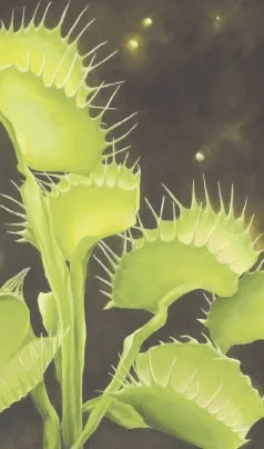 Venus flytraps emit a lively yellow glow, inviting fireflies in for dinner. Delicate, pale brown loggerhead turtle eggs huddle together in a sandy hollow. A relict trillium with carefully defined shadows on its petals is painted with a care that borders on the clinical, but it still looks fancy. Even a giant palmetto bug looks harmless, eschewing its more revolting qualities. It could almost be another seed or plant — only its fire-flecked colors reflect its creepy crawly capacities.